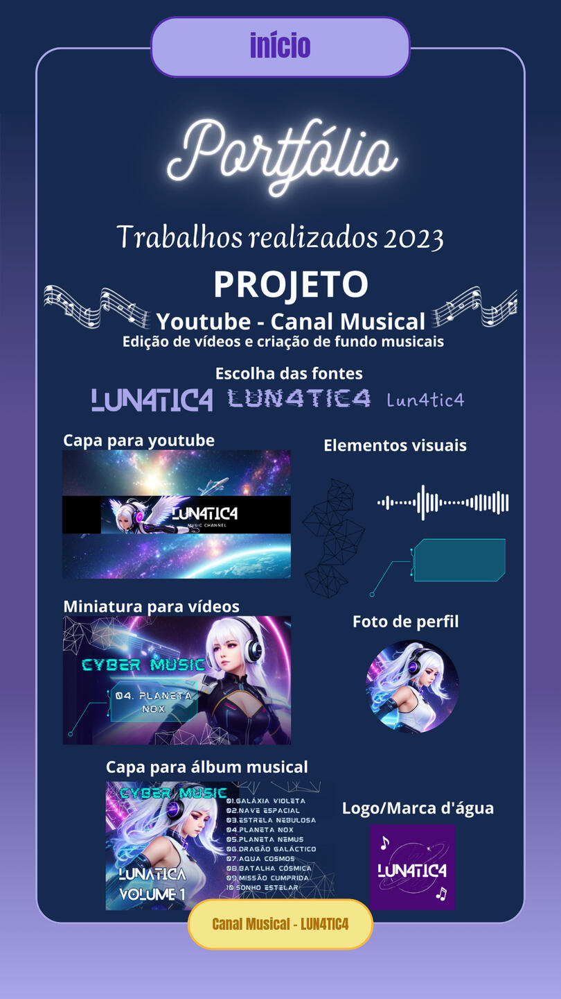 Tuvu Jean_747 Jotapê Games, Luna.Vtuber.Oficial.Projeto - Canal do Youtube Musical, incluindo criação de fundo musical sem direitos autorais, capa para youtube, miniaturas para vídeos, imagem para perfil, capa para álbum musical, logo simples e marca d'água.(imagens do personagem geradas com uso de IA) visite o canal LUN4TIC4.Projeto de criação de desenvolvimento de jogos digitais, jogos educacionais para a plataforma Power Point e uso didático, jogos para entretenimento e divulgação de marca na plataforma itchi.io.Criação e programação de jogos digitais estilo Visual Novel.
