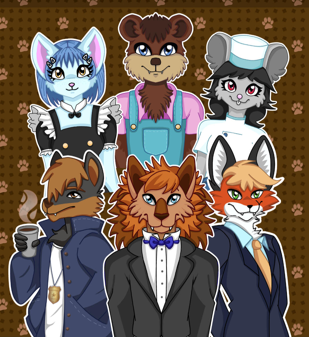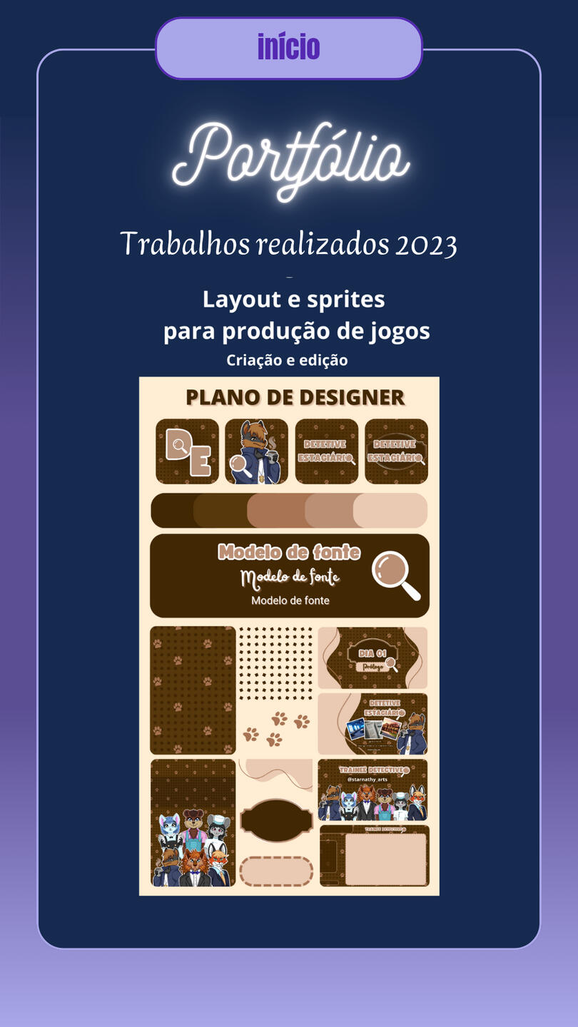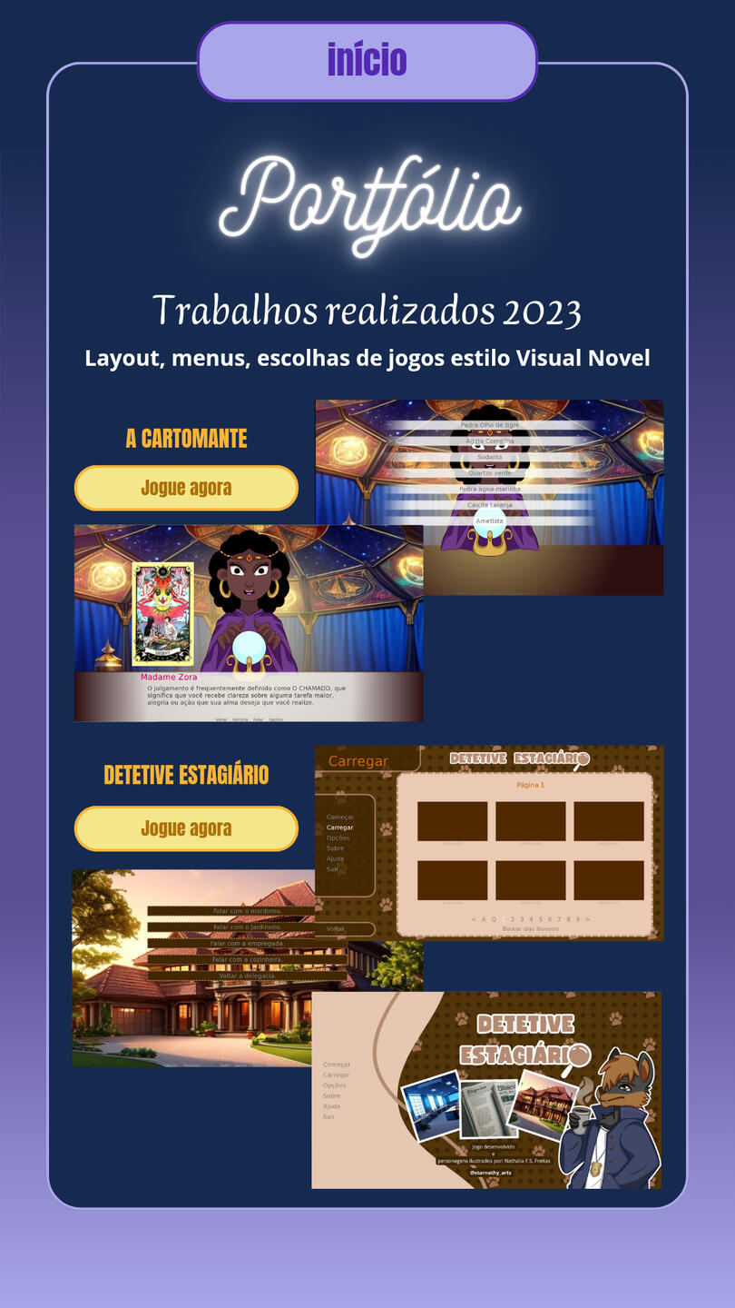 Modelos de sprites de personagens (Visual Novel) desenvolvido para o jogo Detetive Estágiario e A Cartomante.Ilustração de Layouts e HUBs para jogos digitais em geral.